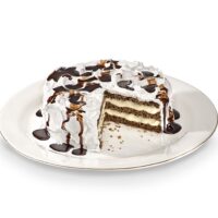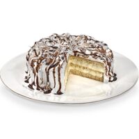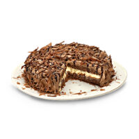 Bolo de chocolate recheado com creme de trufas branca e negra com leve sabor de rum, coberto com marshmallow, calda e raspas de chocolate.