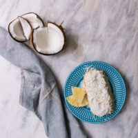 Bolo branco recheado e coberto com creme de coco, calda de abacaxi e coco em flocos.