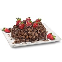 Bolo de chocolate recheado com creme de trufa branca com leve sabor de rum e morangos, com cobertura de chocolate meio amargo com leve sabor de rum, rolinhos de chocolate ao leite e morangos.
