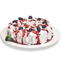 Bolo branco umedecido com calda de frutas silvestres*, recheado com creme de baunilha, coberto com marshmallow, calda de frutas silvestres e amoras.