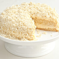 Bolo branco recheado e coberto com mousse e raspas de chocolate branco.