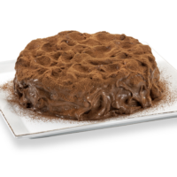 Bolo de chocolate recheado e coberto com creme trufado e creme de trufa negra com leve sabor de rum e cacau em pó.