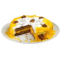 Bolo de nozes recheado com ovos moles, coberto com marshmallow, nozes e fios de ovos.