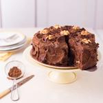 Bolo de chocolate recheado e coberto com creme de chocolate e crocante de castanhas.